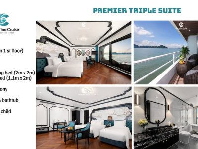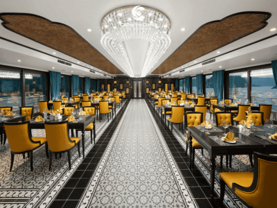- 12:45| Thưởng thức bữa trưa tại nhà hàng sang trọng với những món ăn được chế biến hấp dẫn bởi các đầu bếp chuyên nghiệp của Catherine. Trong lúc đó tàu di chuyển đưa Quý khách ngắm nhìn cảnh quan đặc sắc, tạo bởi vô vàn đảo đá vôi xứng danh Di sản thiên nhiên thế giới.
