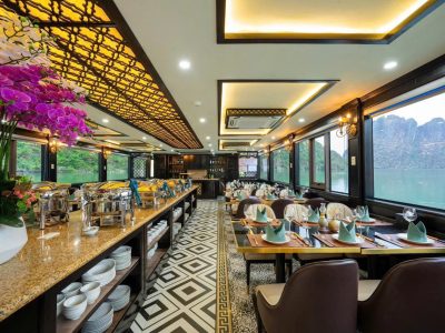 - 12:00: Du khách thưởng thức bữa trưa Buffet cao cấp với những món ăn Hải sản tươi ngon đặc sắc của vùng biển Hạ Long cũng như các món ăn truyền thống của Việt Nam. (Nếu tàu chạy dưới 20 khách, Quý khách sẽ được phục vụ ăn trưa theo Set Menu)