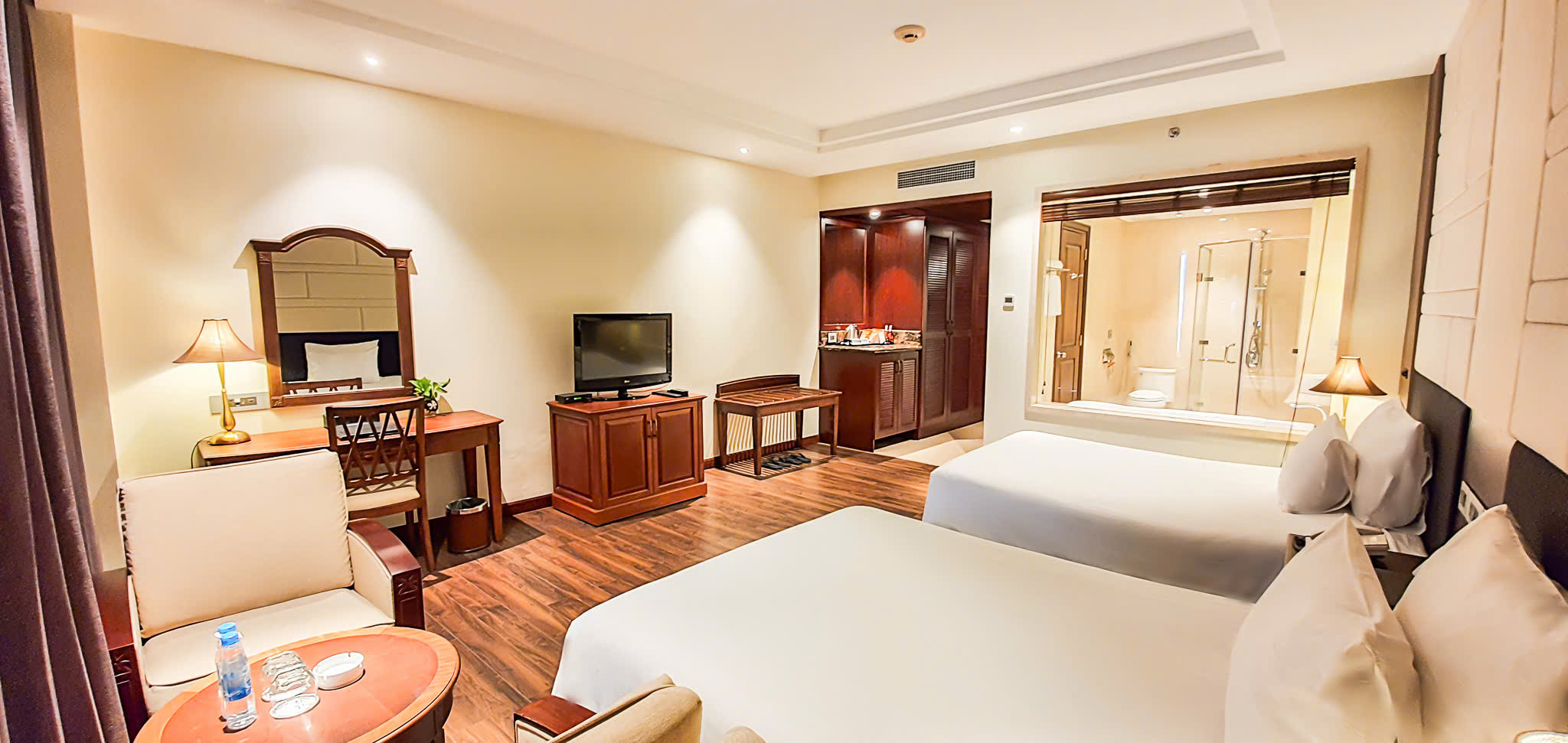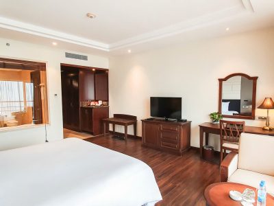 - Phòng Superior: Phòng có diện tích 37m2, được bố trí 01 giường đôi 1,6m hoặc 02 giường đơn 1,2m, khung cửa sổ rộng mở ra không gian hướng thành phố thoáng đãng. Ngoài ra, phòng được trang bị thêm két an toàn và điện thoại trong phòng tắm.