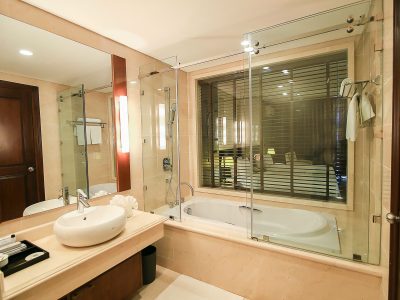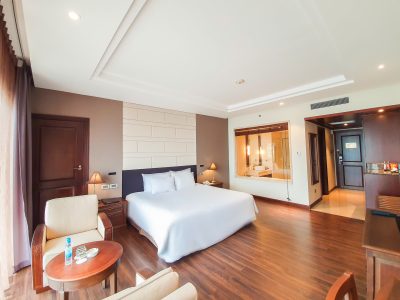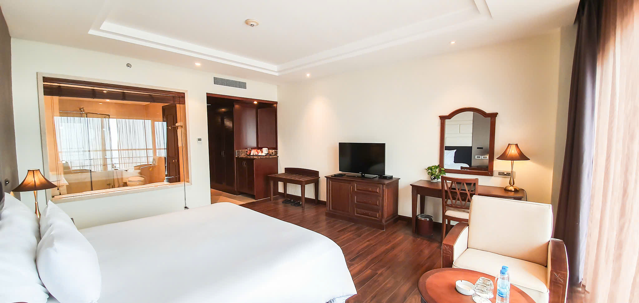 - Phòng Executive Suite: Phòng có diện tích 82m2, được trang bị hiện đại tiện nghi với 01 phòng ngủ với 01 giường đôi lớn, 01 phòng khách, 02 phòng tắm riêng biệt tiện nghi, bàn ghế sofa, bàn ăn dành cho 04 người và ban công riêng nhìn ra toàn cảnh thành phố và vịnh Hạ Long