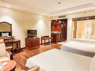 - Phòng Deluxe: Phòng có diện tích 41m2, được bố trí 01 giường đôi lớn hoặc 02 giường đơn từ 1,2 – 1,4m, phòng được trang bị thêm két an toàn và điện thoại trong phòng tắm và đặc biệt là các phòng đều có ban công riêng hướng ra vịnh Hạ Long.